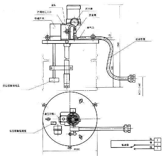 6、本泵設有低位報警裝置,報警后應及時地向油筒內充填潤滑脂。