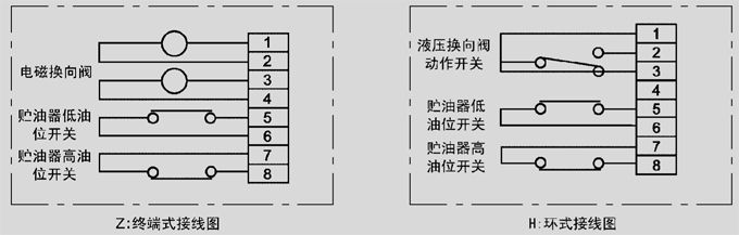 終端式結構電動潤滑泵配用電磁換向閥,有二個接口,外接二根供油主管,依靠電磁鐵的得失電實現換向供油。 柱塞泵換向閥的動作原理詳見使用說明書。