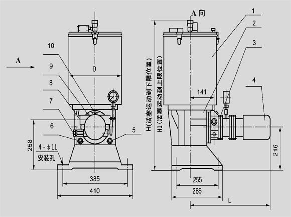 1、貯油筒;2、泵座;3、帶連結(jié)法蘭的柱塞泵裝置;4、減速電機(jī)5、加油口 G3/ 4;