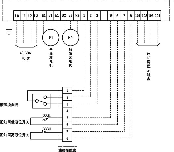 控制箱能發出“供油時間延長”、“加油泵超載”、“超負載運轉”等故障信號。箱內設有一組外部接點,可向主機或主控室發送系統運轉狀況(停止、運轉、故障)信號。