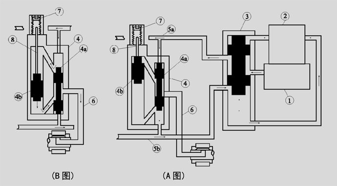 如下圖所示,潤滑泵①從貯油器②吸入潤滑脂,經過換向閥③由供油管5a輸送到分配器,進入分配器后加壓于先 導活塞4a。先導活塞下腔與供油管5b連通,經換向閥③向貯油器開放。(A圖)