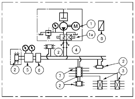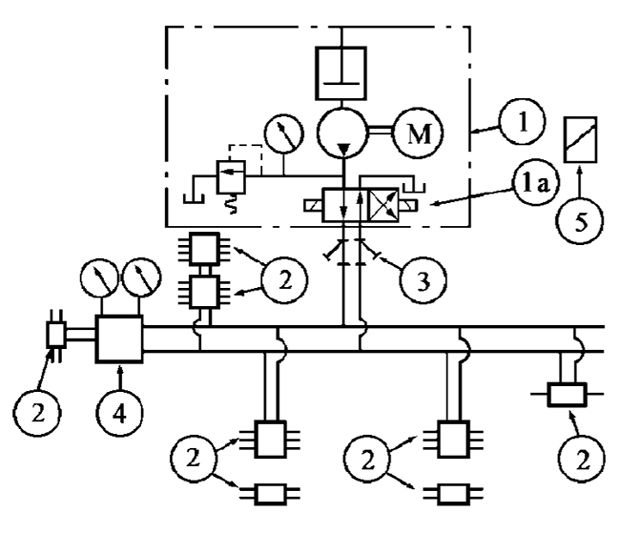 由換向閥1a的位置決定潤滑泵①輸出的潤滑脂經兩條供油主管的某一條供送,另一條向貯油器開放。