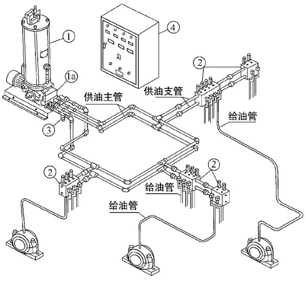 供油主管末端裝有壓力操縱閥④,當末端壓力達到設定壓力,向電控箱發送信號,電磁換向閥1a換向,潤滑泵①停止,系統一次給油工作完成。經過設定的時間間隔后,系統再次工作,從另一條主油管供油。