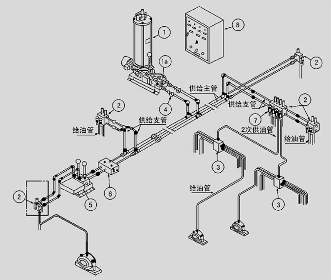 基本動作和前述電動終端式系統相同;二次分配由雙線式分配器②的出油口接二次供油管向遞進式分配器③供油,這樣,雙線式分配器一個出油口可向4-8個潤滑點給油。