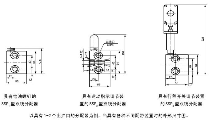 2、帶有行程開關(guān)調(diào)節(jié)裝置的分配器(SSPQ3型),每塊只帶一件限位開關(guān)調(diào)節(jié)裝置,如有特殊需要,每對出油口都可配帶,須注明配帶數(shù)量,單獨訂貨。