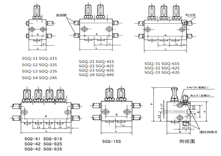 SGQ雙線給油器有單向出油和雙向出油二種結構形式。單向出油的給油器只有下給油孔,活塞正反排油時都由下給油孔向潤滑點供送潤滑脂;雙向出油的給油器有上、下給油孔,活塞正反向排油時由上下給油孔交替向潤滑點供送潤滑脂。
