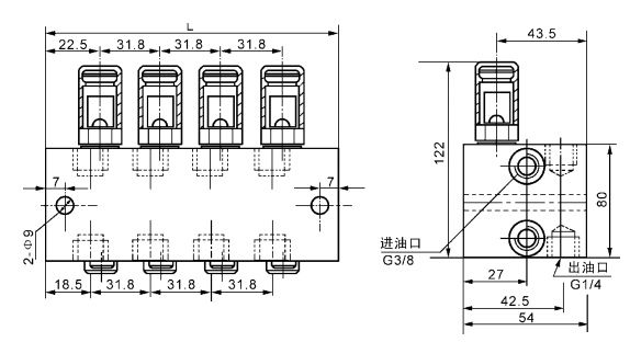 若需相應(yīng)上下出口合并時(shí),只要將孔內(nèi)的螺釘擰出,把上或下不用的那個(gè)出油口用 G1/4 螺塞封堵以防灰塵侵入。