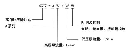 如采用 A 系列,高壓流量為 2.5L/min;高壓壓力為 31.5MPa,低壓供油壓力為 0.4MPa;而低壓供油量為 40L/min 的高(低)壓稀油站,采用 PLC 控制的則按如下方法標注:GXYZ-A2.5/40.