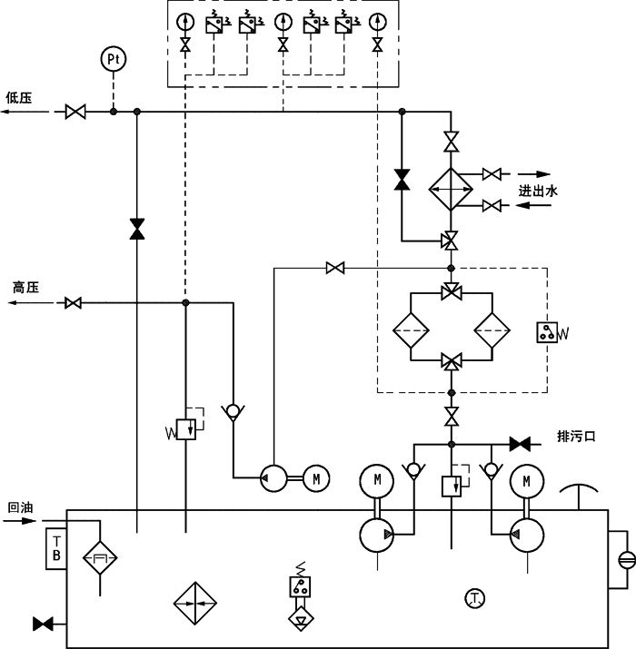 本產(chǎn)品主要由油箱(其內(nèi)裝有磁網(wǎng)過濾器)、低壓油泵裝置、高壓油泵裝置、雙筒網(wǎng)片式過濾器、冷卻器、管道、閥 門、儀表盤及電控柜等組成。
