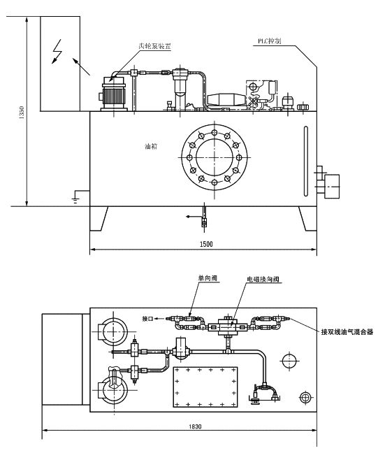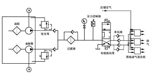 YQ-2型雙線油氣潤滑裝置為一種雙線型系統,由油氣站,空氣操作盤和多個雙線油氣混合器組成。油氣站包括齒輪泵、安全閥、過濾器、電磁換向閥和PLC電氣控制柜,系統工作時,壓力油經齒輪泵壓出,經電磁換向閥進入油氣混合塊。油氣混合塊包括雙線分配器和混合器兩部分,油在分配器中被定量分配后壓入混合器,在混合器中,定量的油在不間斷壓縮空氣的作用下進入潤滑點。雙線分配器的兩個進油口一個進油,則另一個回油,由電磁換向閥切換。