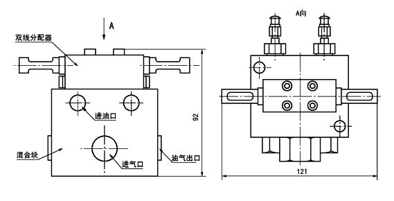 雙線油氣混合器由一個或多個雙線分配器和一個混合塊組成,油在分配器中定量分配后,通過不間斷壓縮空氣進入潤滑點。