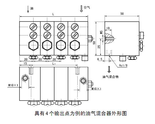 油氣混合器是整個裝置的一個組件,設有一個進氣口和一個進油口,輸出流量有0.01,0.03,0.06及0.1mL幾種規格可選,輸出點數目從2,3,4,5,6,7,8點可選;如果系統需要的潤滑點數目超過8點,請另加混合塊。
