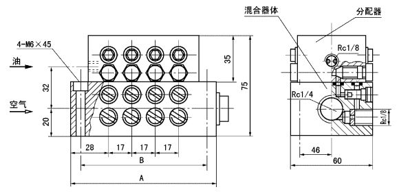遞進式油氣混合器由一個分配器(上)和一個混合器體(下)組成,分配器把輸入的油分成若干部分輸進混合器體,通過不間斷的壓縮空氣將油送入到潤滑點。根據出油口數分為 5 種規格。這種油氣混合器適用于遞進式和保壓式兩種系統。