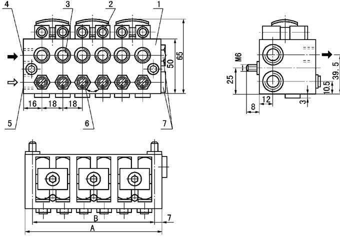 1、混合器體 2、分配器 3、出油口 G1/8 4、供油口 G1/4 5、進氣口 G1/4 6、空氣調節螺釘 7、螺堵(用于單側進油型)